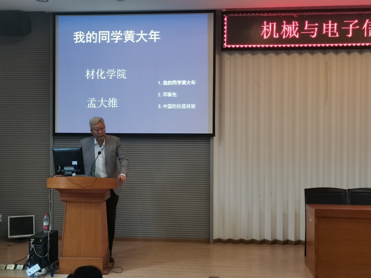 孟大维教授的报告分为三个部分。第一部分主要讲述了其大学同班同学黄大年的先进事迹。黄大年,先后毕业于吉林大学和英国利兹大学,是国际知名战略科学家、中国著名的地球物理学家,曾入选国家级人才计划。12年前,黄大年放弃了在英国优厚的待遇,怀着一腔爱国热情返回祖国,出任吉林大学地球探测科学与技术学院教授、博士生导师。八年时间,他带领团队在航空地球物理领域取得一系列成就。孟大维教授认为,英雄从来不是偶然。大学毕业时,黄大年在给同学的毕业赠言中就写道“振兴中华,乃我辈之责”的豪言壮语,与其他同学的留言形成了鲜明的对比,突显了黄大年立志报国的少年大志。回国后的他并没有忘记他的初心,在完成繁重科研任务的同时亲力亲为地培养了一批又一批科学研究人才,深受同学爱戴。然而,令人痛心的是,由于同时负责多个科研项目,加之日常对自己疾病的不重视,最终不堪身体重负。