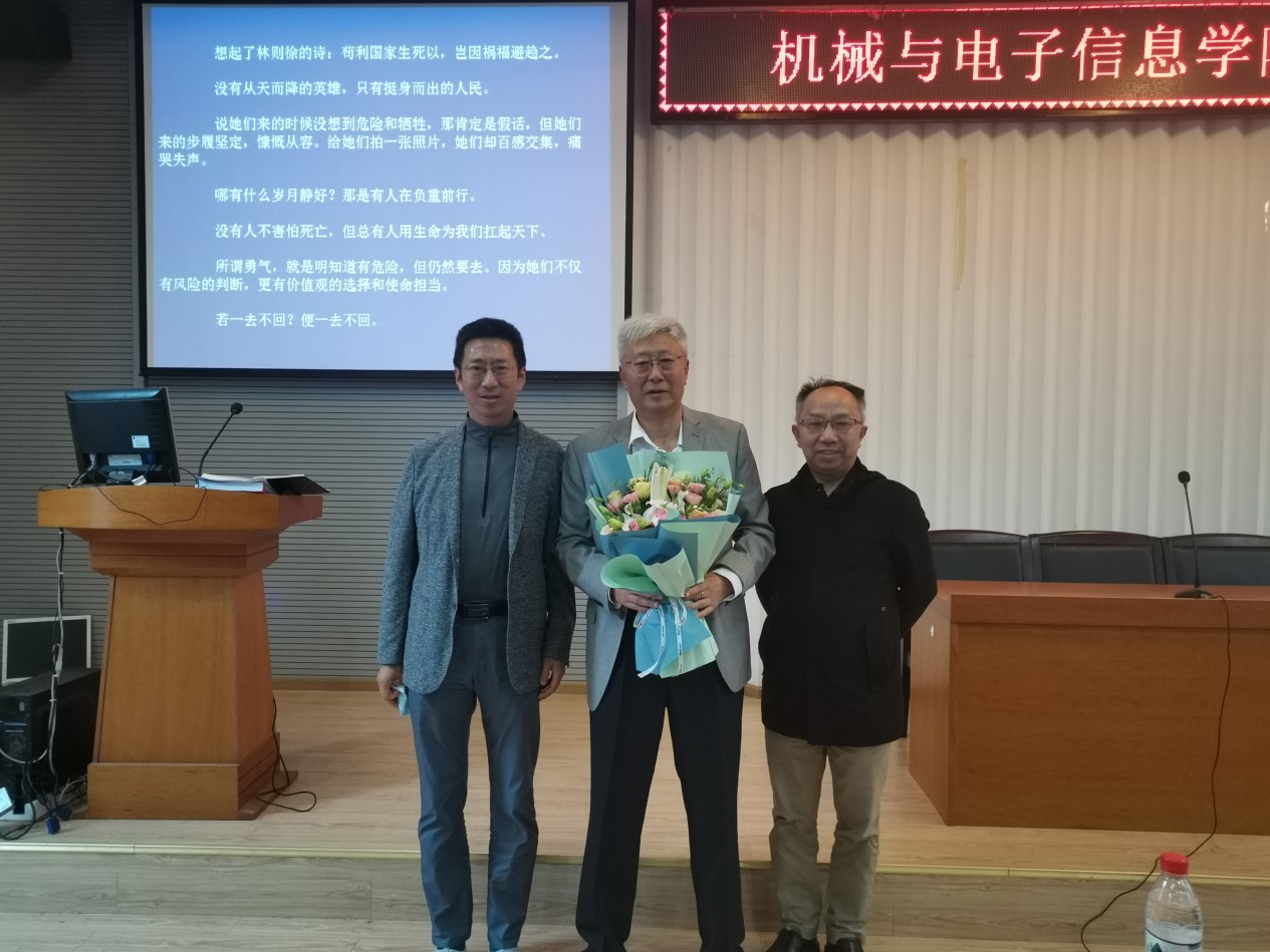 第三个部分孟教授结合自己的亲身体验讲述了武汉抗疫的故事。在疫情期间,孟教授多次看着新闻报道动容落泪,他深刻感受到了国家力量。他认为我国抗疫成功还有一条重要经验就是中央派指导组进驻武汉,协调全国物资调配,与武汉人民感同身受。孟大维教授呼吁全体教师,志存高远,脚踏实地,承担起教师的使命与担当,把个人奋斗与国家发展紧密联系起来,时刻做好准备等待祖国的召唤,为中华之崛起而努力奋斗!最后,李波副院长代表全院教师向孟教授献花致敬并合影留念。