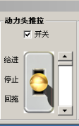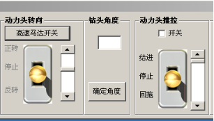 步骤7:点击“高速马达开关”,选择“正转”,在“动力头推拉”组合框内先点击“开关”复选框控件开启允许进给操作,上下移动滚动条调节动力头进给速度,钻头保持直线进给(第一根钻杆一般保持直线钻进以保护钻机)。